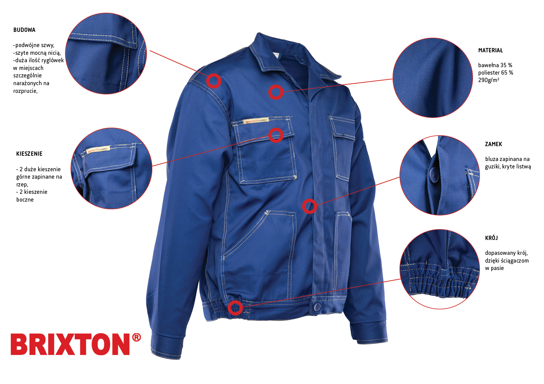 dwie górne kieszenie kryte listwą, zapinaną na rzep,