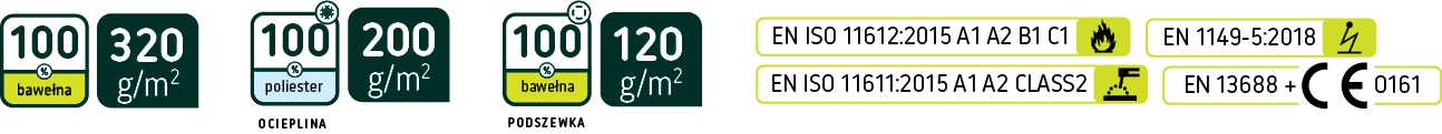 EN ISO 11611:2007 , EN ISO 13688:2013 , EN 1149-5:2018