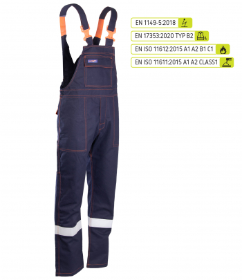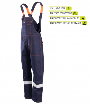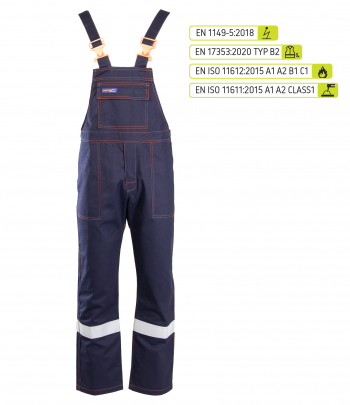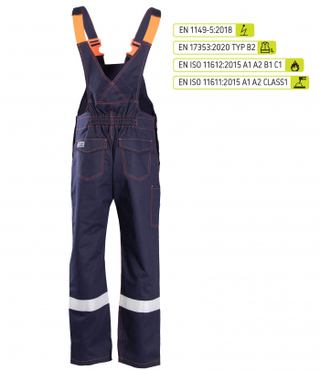 EN 1149-5:2018 , EN ISO 11611:2015 A1 A2 CLASS 1 , EN 17353:2020 TYP B2 , EN ISO 11612:2015 A1 A2 B1 C1 , EN ISO 13688:2013